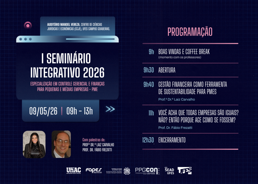 A Universidade Federal do Espírito Santo (Ufes) realiza, no dia 9 de maio, das 9h às 13h, no Auditório Manoel Vereza (CCJE/Ufes), o I Seminário Integrador da Pós-Graduação em Controle Gerencial e Finanças para Pequenas e Médias Empresas (PME), com o tema “Sustentabilidade financeira e singularidade empresarial: reflexões sobre a gestão nas pequenas e médias empresas”.